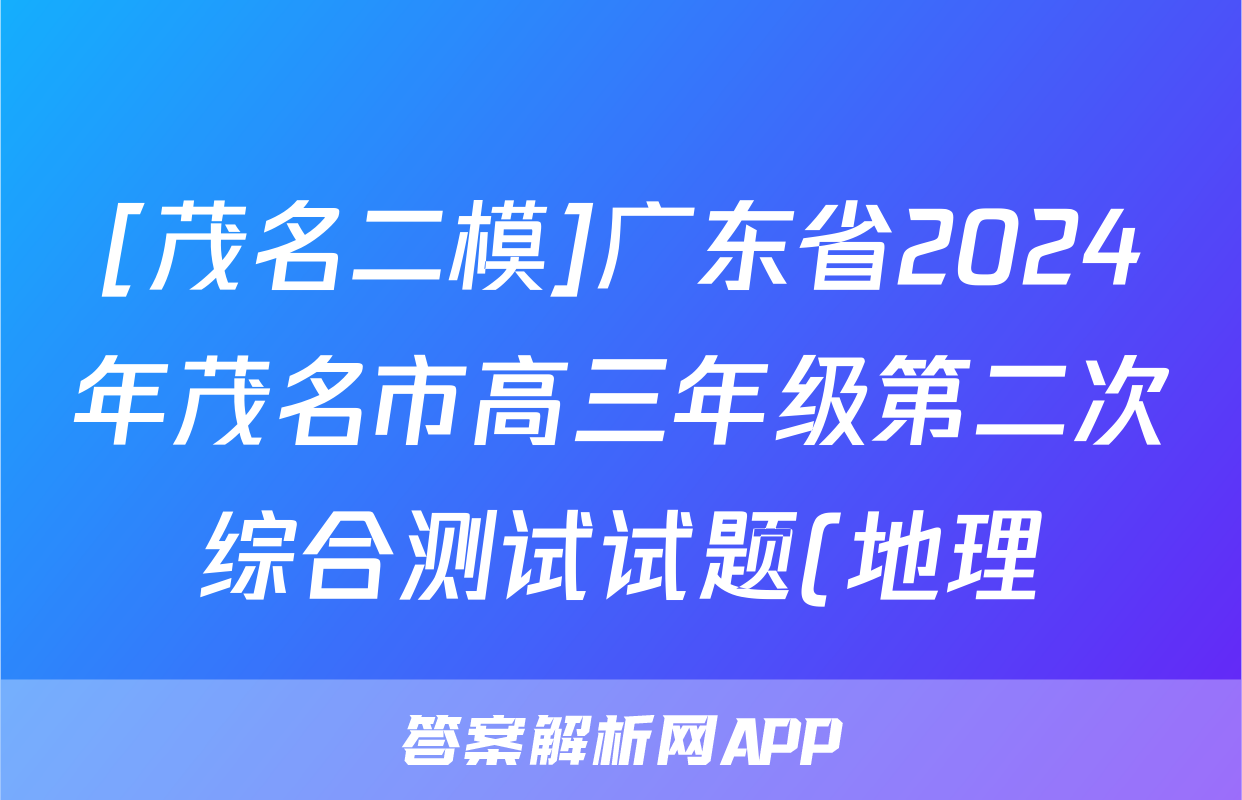 [茂名二模]广东省2024年茂名市高三年级第二次综合测试试题(地理)正在持续更新,目前2026天舟高考答案网为大家整理了相关试题及答案,供大家查缺补漏,高效提升成绩。