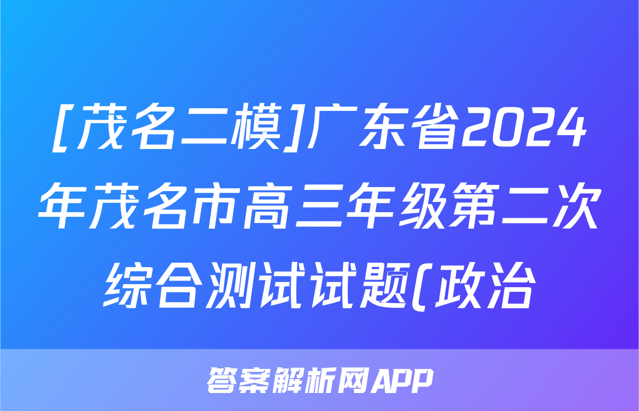 [茂名二模]广东省2024年茂名市高三年级第二次综合测试试题(政治)正在持续更新,目前2026天舟高考答案网为大家整理了相关试题及答案,供大家查缺补漏,高效提升成绩。