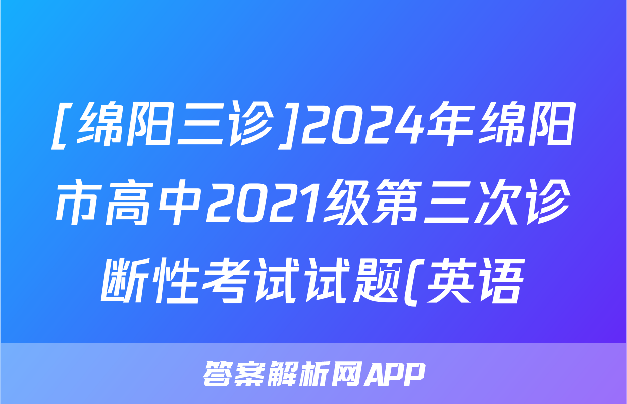 [绵阳三诊]2024年绵阳市高中2021级第三次诊断性考试试题(英语)正在持续更新,目前2026天舟高考答案网为大家整理了相关试题及答案,供大家查缺补漏,高效提升成绩。