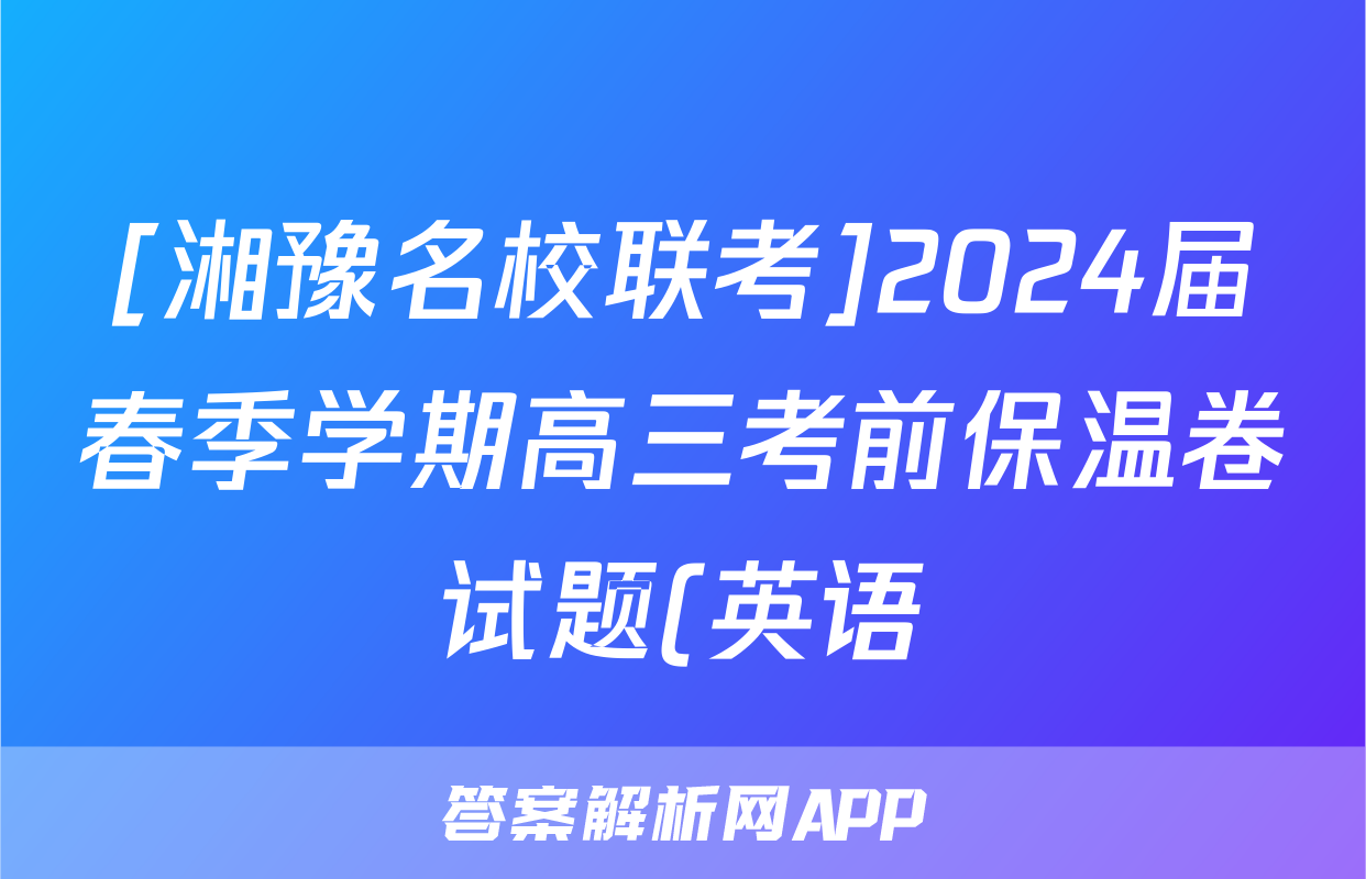 [湘豫名校联考]2024届春季学期高三考前保温卷试题(英语)正在持续更新,目前2026天舟高考答案网为大家整理了相关试题及答案,供大家查缺补漏,高效提升成绩。